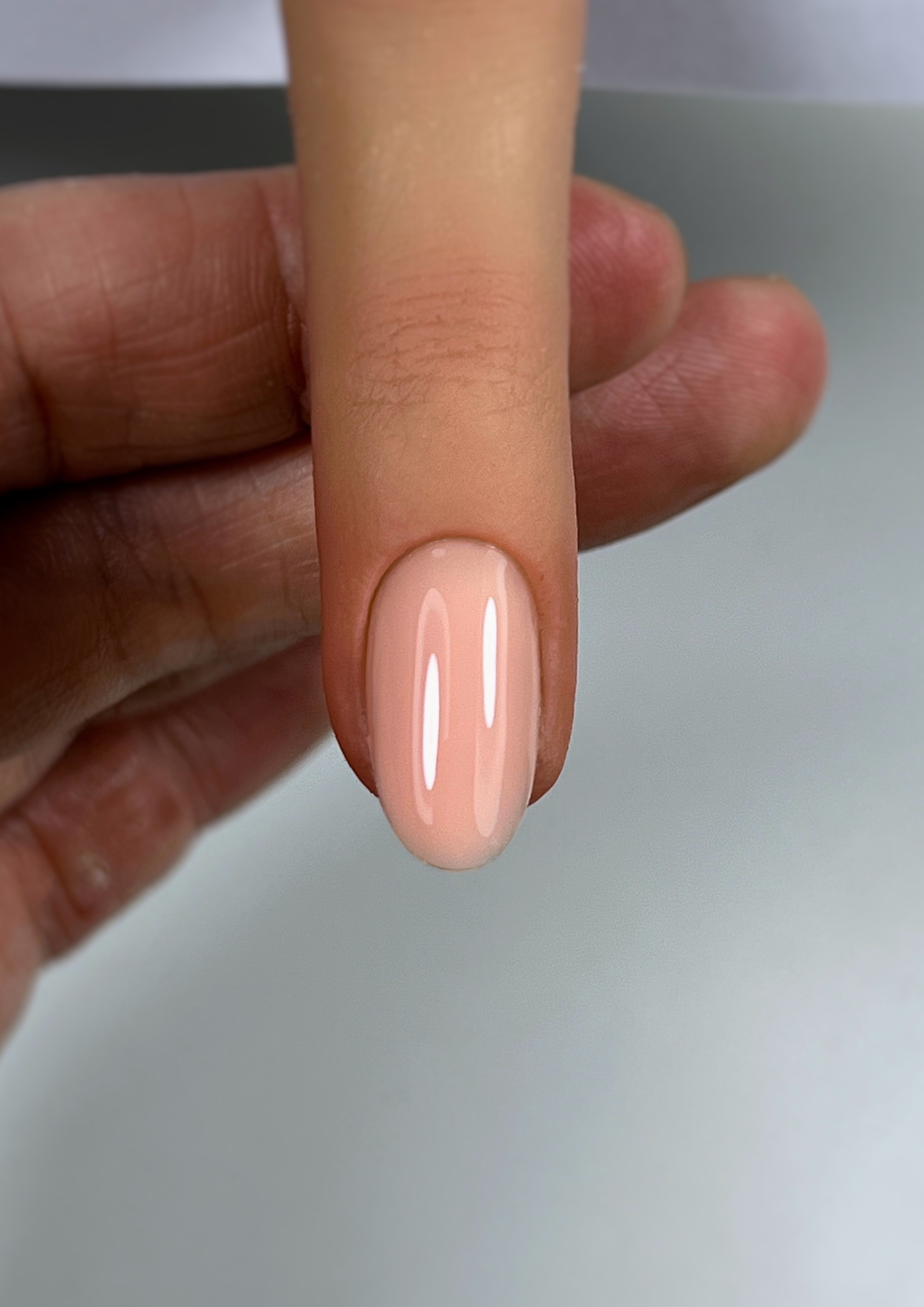 Apply a very thin layer of the base to the carefully prepared nail plate (do not cure yet, the layer serves as a "contact layer" for the next thicker layer). Then use more to build up the curve and the stress point.